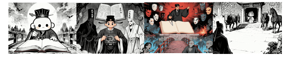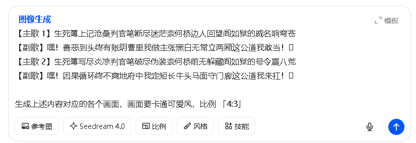 避坑技巧:如果觉得歌词不够“有画面”,直接追加提示词“增加动作描写,比如‘翻生死簿’‘挥判官笔’”,豆包会立刻优化。第二步生成对应画面继续打开豆包,将生成的歌词输入并写上提示词:生成上述内容对应的各个画面,画面要卡通可爱风,比例 「4:3」