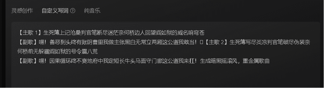 不用等太久,豆包1分钟就能出稿,晓晓洋亲测的成品截取一段给大家参考:【主歌 1】生死簿上记沧桑判官笔断尽迷茫奈何桥边人回望阎如狱的威名响穹苍【副歌】嘿!善恶到头终有账阴曹里我做主张黑白无常立两厢这公道我敢当!【主歌 2】生死簿写尽炎凉判官笔破尽伪装奈何桥前无躲藏阎如狱的号令震八荒【副歌】嘿!因果循环终不爽地府中我定短长牛头马面守门廊这公道我来扛!