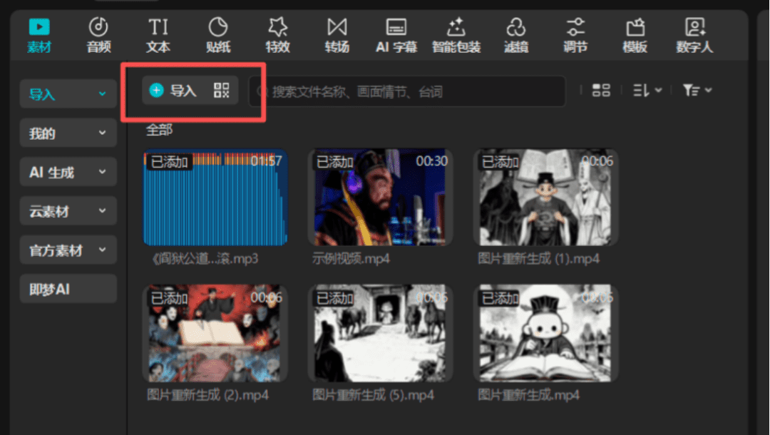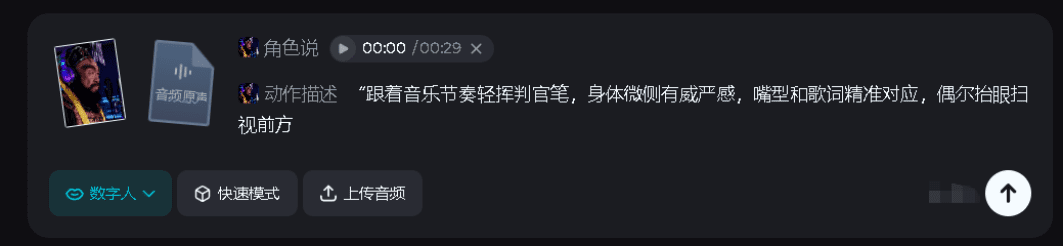 小提示:打开剪映,导入刚下载的音频,把歌曲按“30秒一段”分割(短片段更方便后续对口型,避免画面卡顿),然后分段导出音频,效率直接拉满!3.即梦做视频——30秒让阎如狱“亲自”对口型有了声音,下一步让阎如狱“动起来”,用即梦APP实现“数字人唱歌”效果:打开即梦APP,将阎王的图片上传,点击“对口型”功能,导入第二步分段的音频,再补充动作提示:“跟着音乐节奏轻挥判官笔,身体微侧有威严感,嘴型和歌词精准对应,偶尔抬眼扫视前方”;