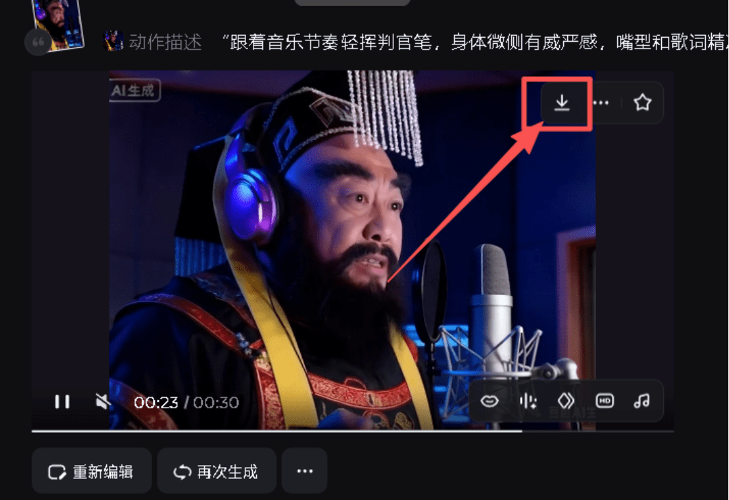 点击“生成”,等30秒左右,阎如狱唱暗黑摇滚的对口型视频就做好了,画面流畅到像真人拍摄!检查视频没问题后下载下来: