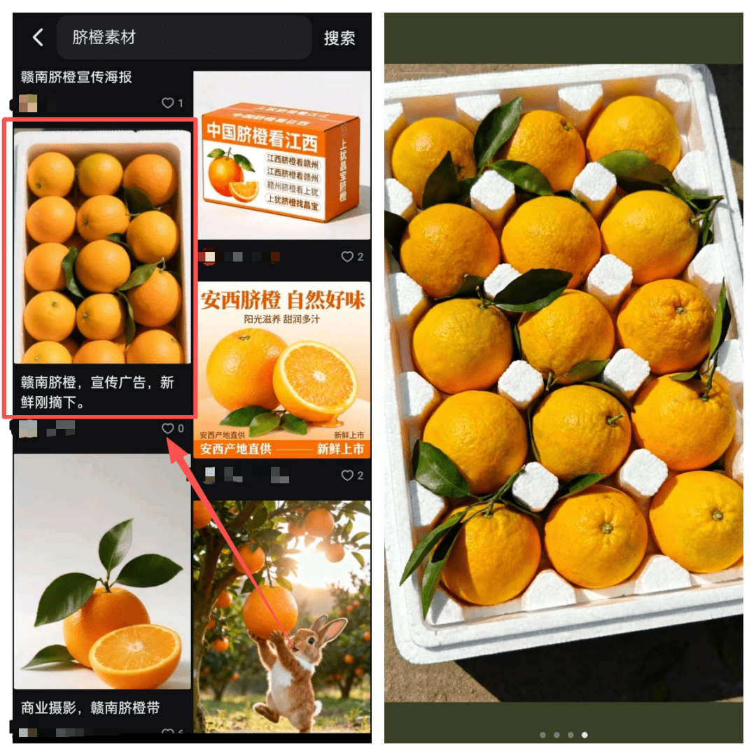 打开手机上的即梦应用,搜索“脐橙素材”,就能找到大量现成的图片。找到合适的图片后,只需点击操作,选择制作同款即可。
