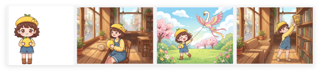 3.把背景换成春天的公园草坪,天空很蓝,有几朵白云,小柚在开心地放一个燕子形状的风筝。4.把背景换成一个充满阳光的现代图书馆,小柚踮着脚,正试图拿取书架顶层的一本厚书,表情有点可爱和努力