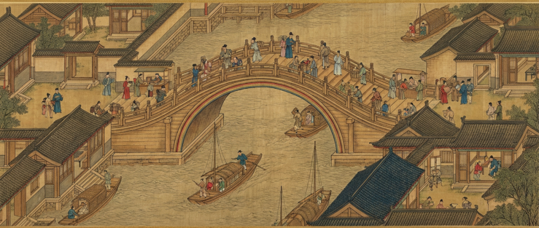 原图提示词:一幅模仿北宋张择端《清明上河图》风格与构图的长卷轴画作的局部。画面内容是汴京城的虹桥段,桥上行人如织,商贩林立,桥下船只穿梭。人物衣着为宋式,建筑为宋代木构建筑。使用中国工笔重彩画风,绢本设色,具有古朴的质感与细腻的笔触。 –ar 16:7