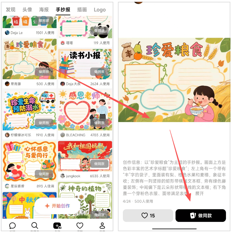 打开手机上的豆包AI,找到创作——然后再最上面找到手抄报这一栏,就会出现很多精美的彩色手抄报,接着咱们往下滑动,找到自己找到自己喜欢的款式,点击进去做同款。