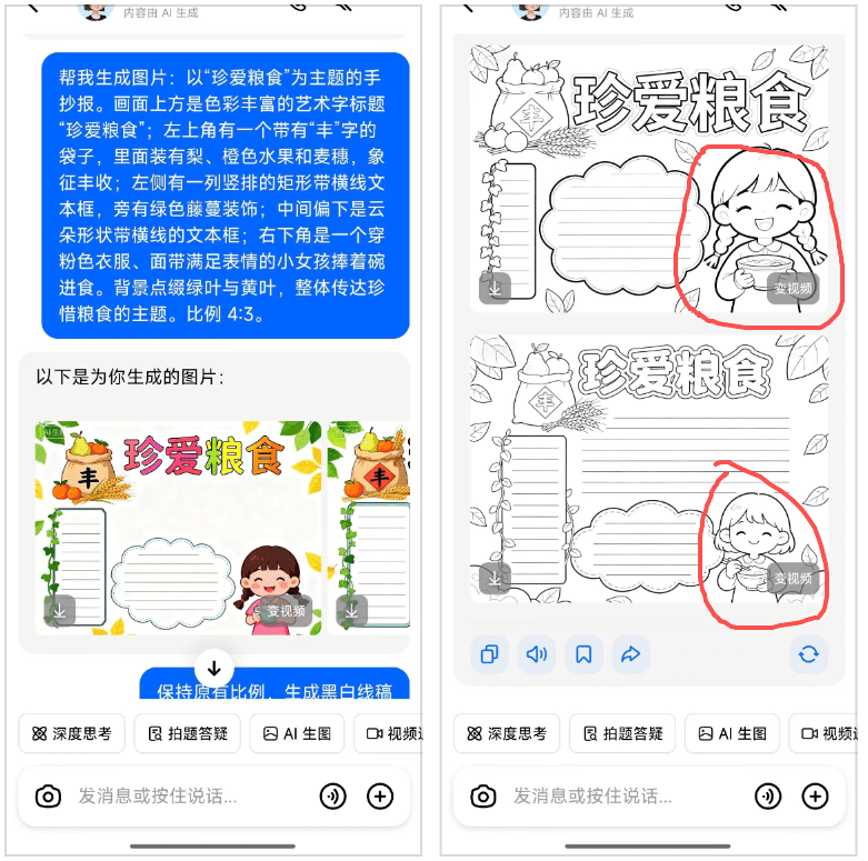 在输入框输入指令的地方咱们可以微调指令,让AI生成不同的人物形象跟背景的手抄报,然后再把彩色手抄报生成黑白线稿的手抄报。