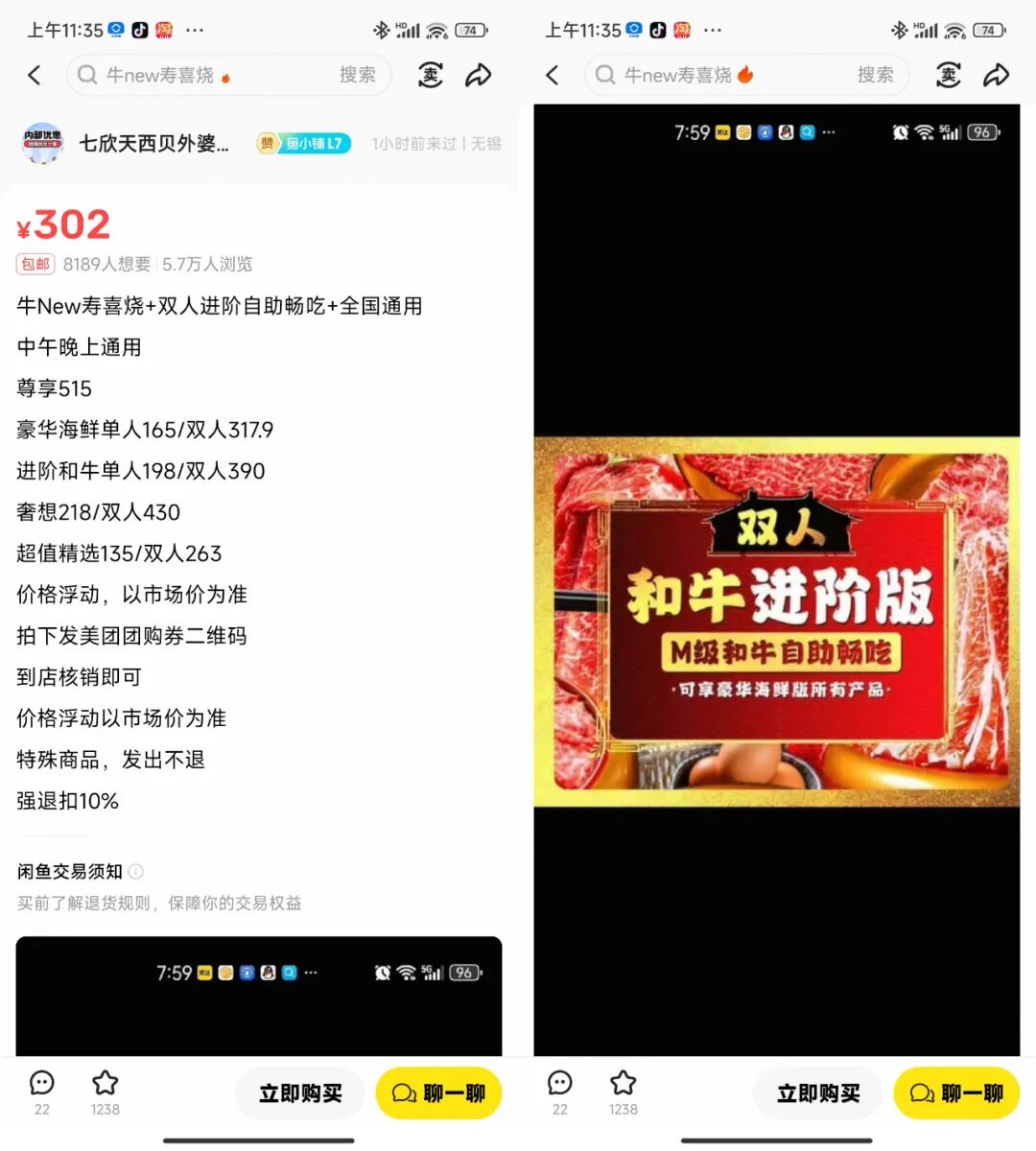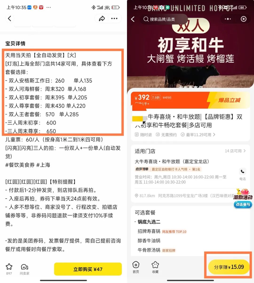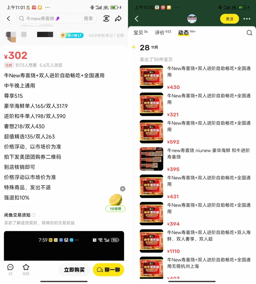 比如:我们可以对比一下上海地区的“牛New寿喜烧”,双人豪华版的价格:美团是342,而闲鱼只有295。