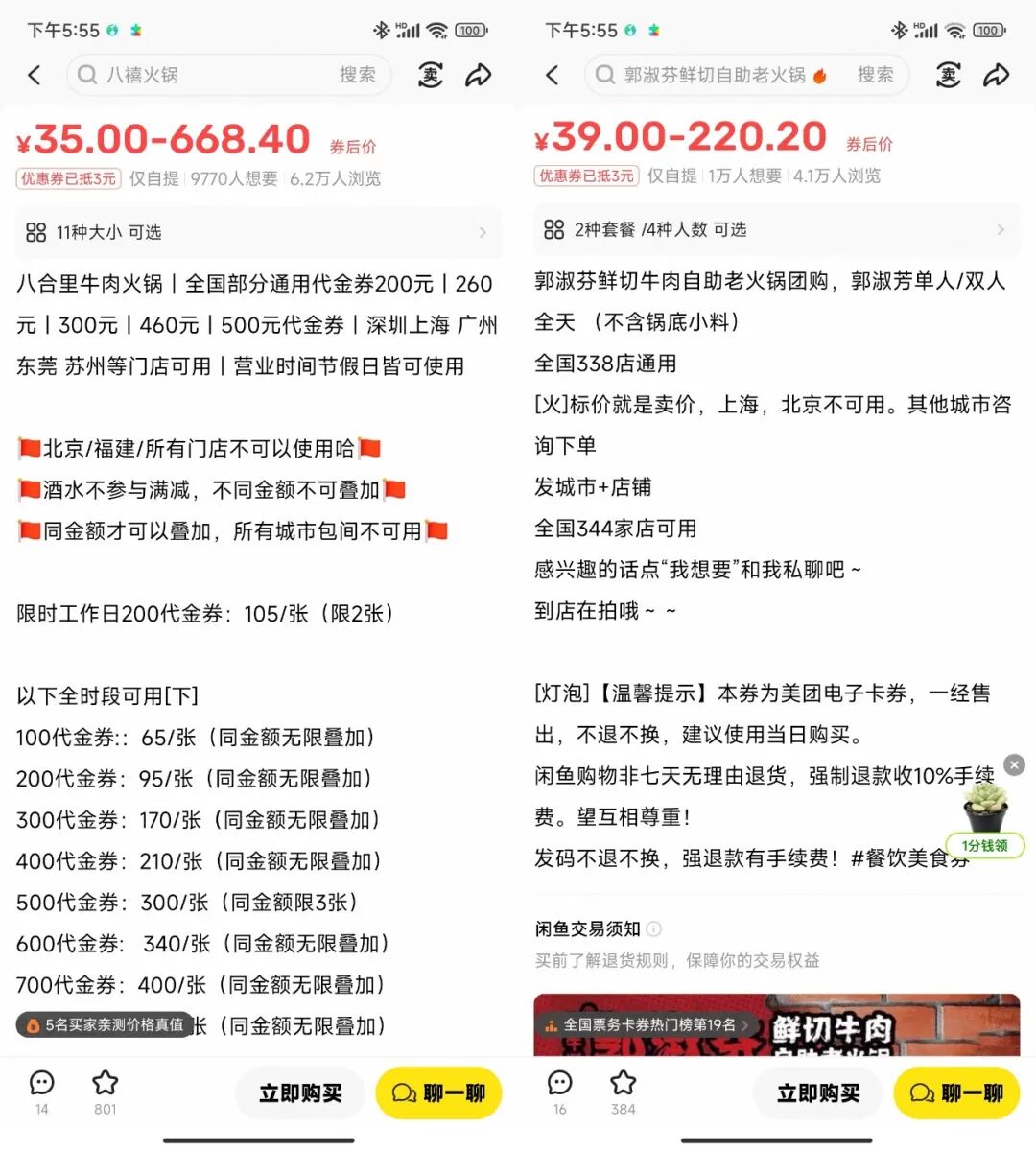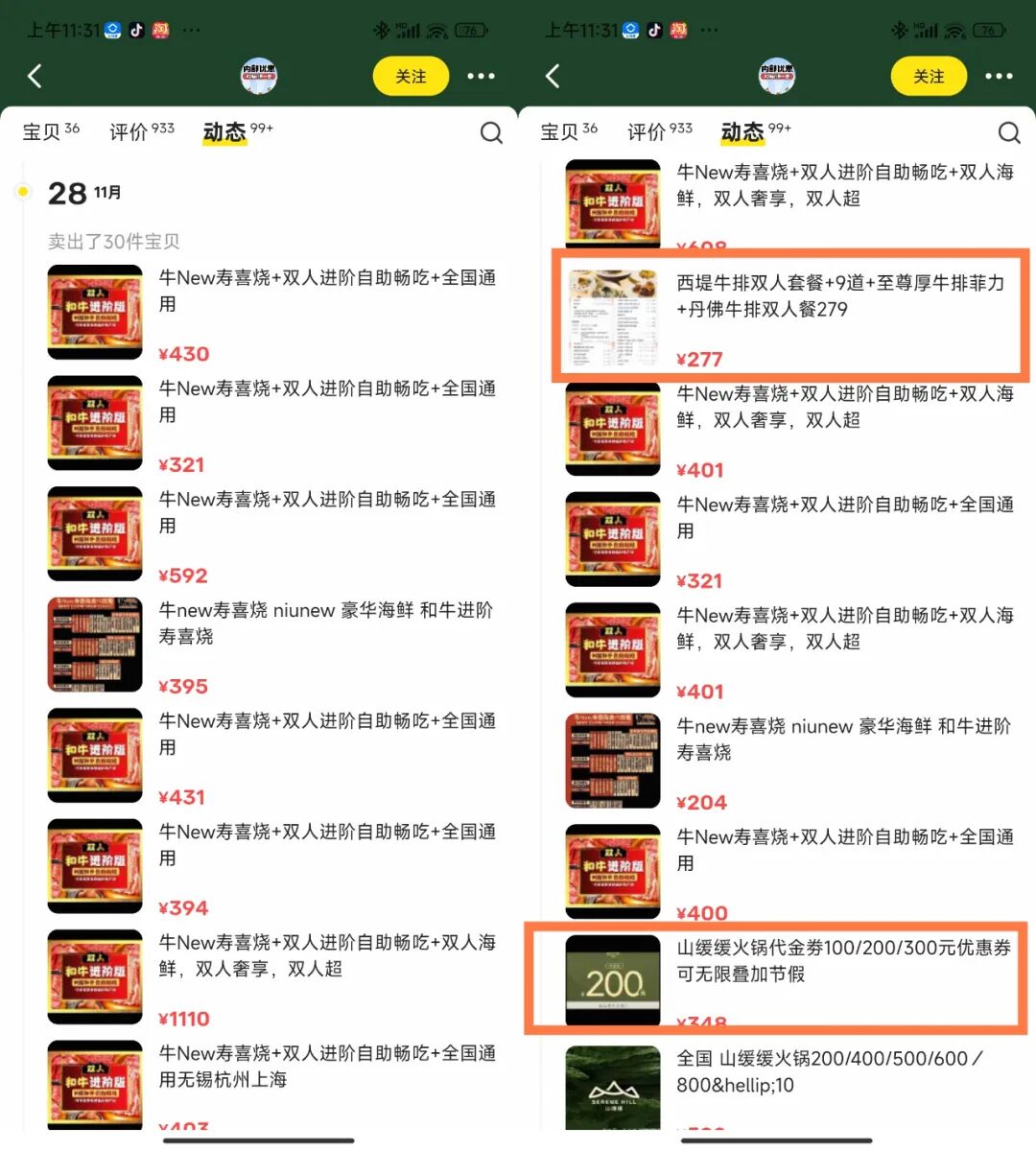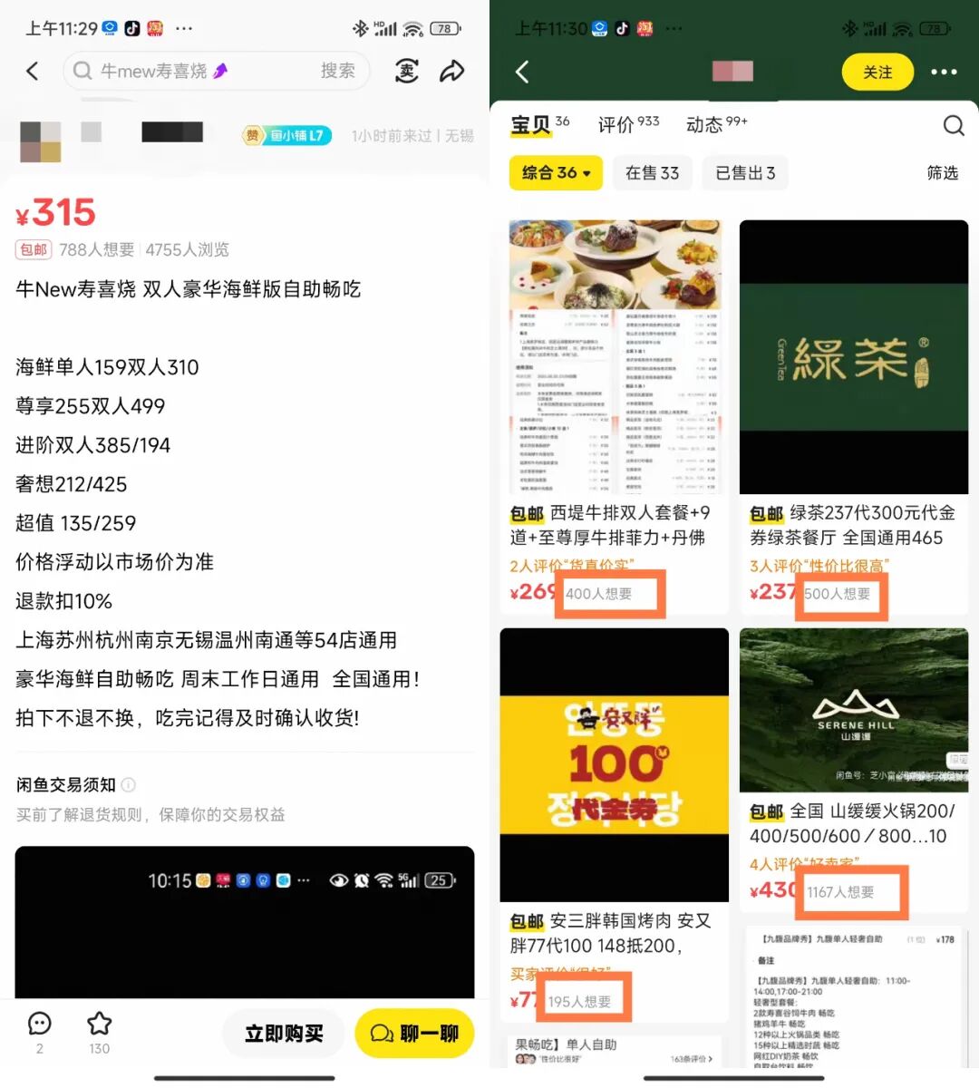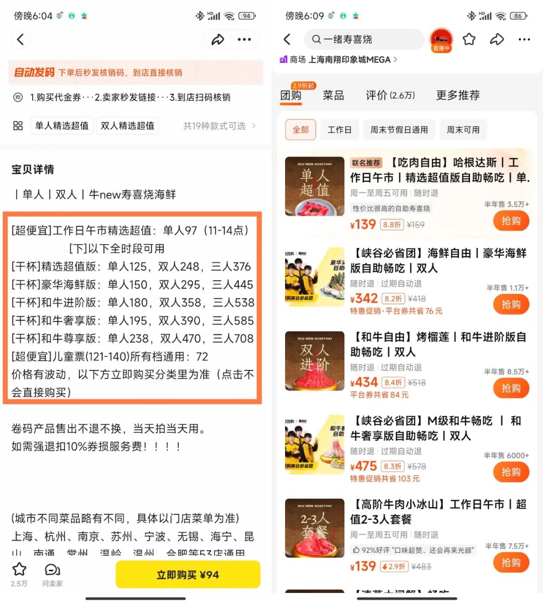 比如:我们可以对比一下上海地区的“牛New寿喜烧”,双人豪华版的价格:美团是342,而闲鱼只有295。