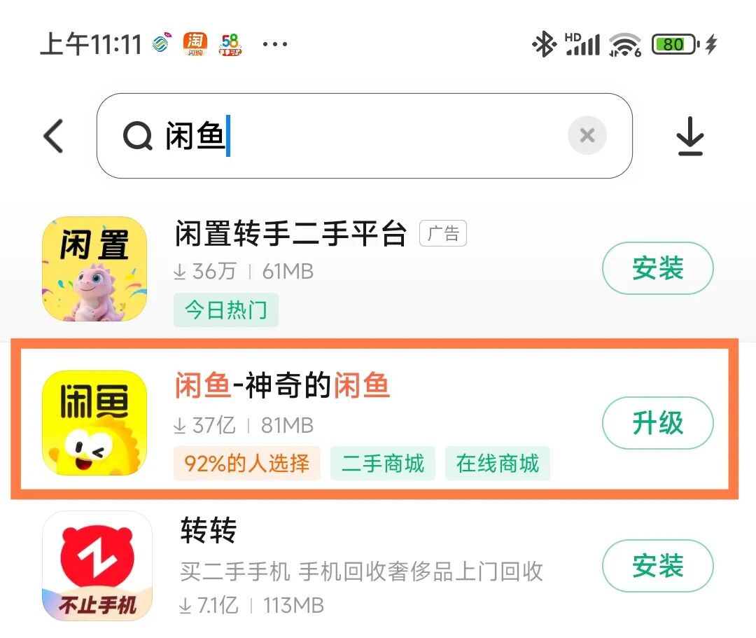 去你们各自的手机应用商店,搜索关键词“闲鱼”,找到一个带有小黄鱼标志的APP,下载安装到你的手机上。