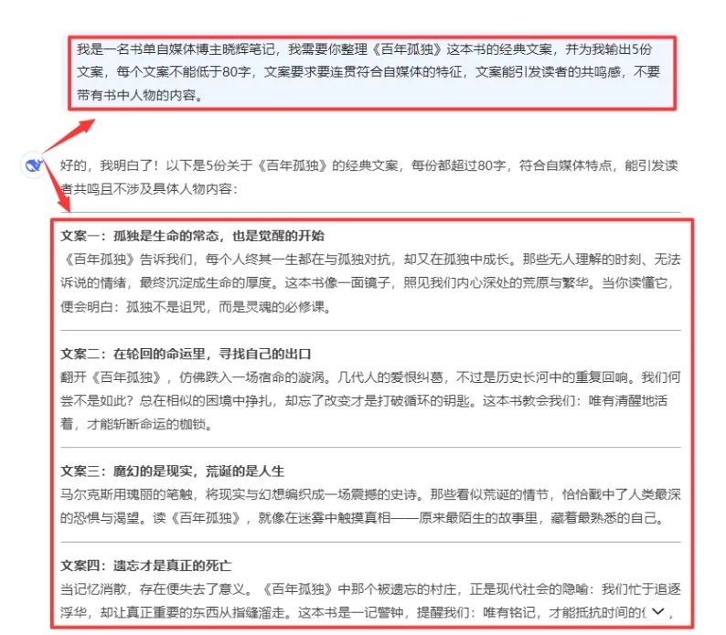 “我是一名书单自媒体博主,我需要你整理《百年孤独》这本书的经典文案,并为我输出 5 份文案,每个文案不低于