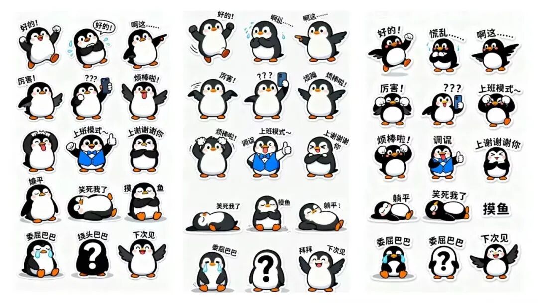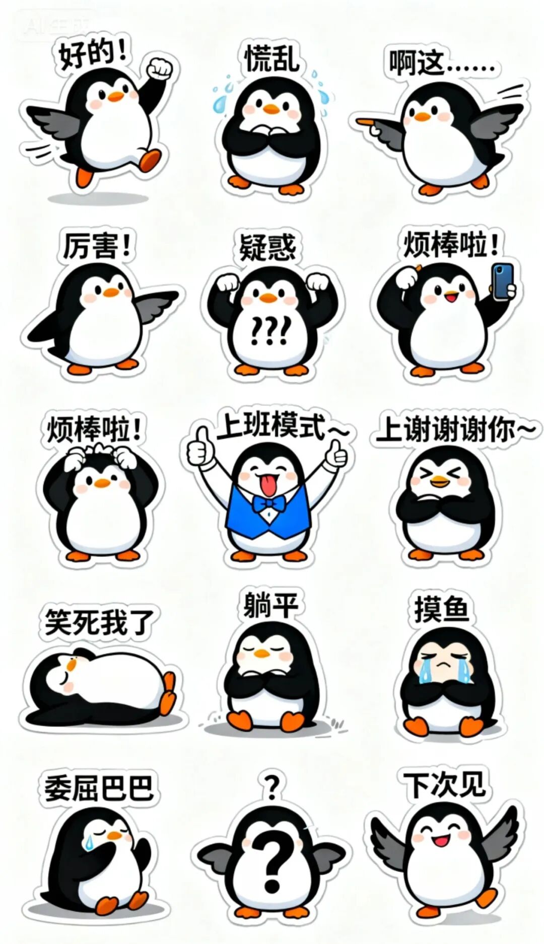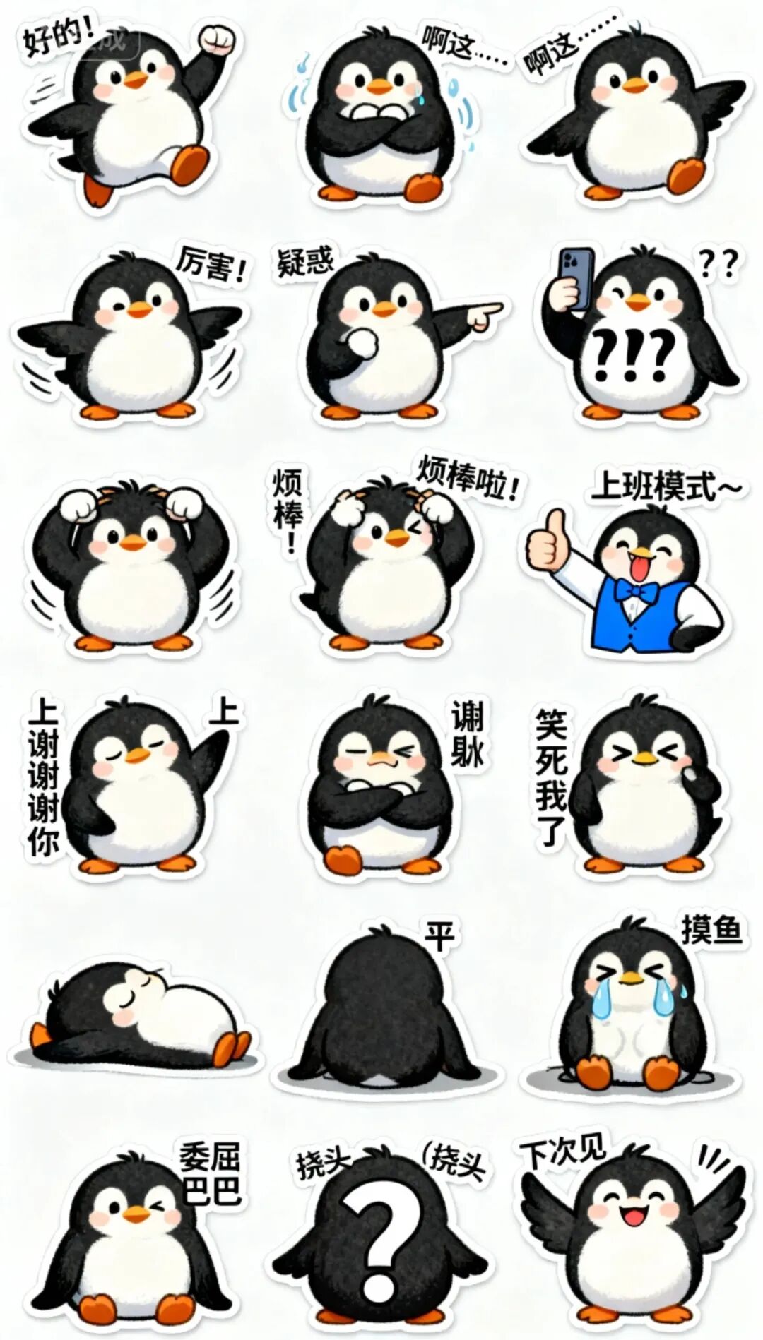今天,义起哥就用如上图这种“可爱企鹅”这个萌萌的潜力股表情包IP,给你们做一次“手把手”的实战演示,当然了,你也可以用其他你喜欢的小动物或者十二生肖或者你自己的美照来作为表情包IP图片,我这边只是先用企鹅作为演示,今天这篇文章不仅仅是一个生成表情包的教程,更是一套“AI表情包快速制作”的搭建指南。我保证,只要你照着我的提示词去跑,你的个人Q版原创IP表情包就稳了!要用AI批量生成表情包图片,那你必须放弃“画一张算一张”的佛系心态,转而用“产品经理”的视角去看待:图片核心:可爱、Q版、贴纸感。图片外观(画风):高饱和度、纯白背景、有描边。图片规格(人设):必须是圆滚滚、黑白橙配色的企鹅,不能跑偏。图片功能(情绪):要覆盖职场、日常、社交等高频使用场景。只有确定了这些“产品规格”,你才能写出那段让AI乖乖听话的“魔法咒语”(提示词),当然了,如果你刚开始没有写这个提示词的思路,那也没关系,你可以找别人做好的类似图片作为参考图进行生成就行,这样的话,也算方便快捷,只是精细化没这么好罢了。Q版企鹅IP表情包制作的全套提示词给大家做个拆解: