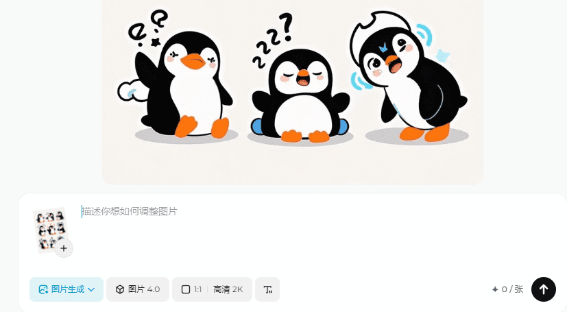 低于0.4:变化太小,表情不够夸张。 高于0.6:形象会跑偏,企鹅会“变种”。批量生成:现在,你只需要小幅修改提示词,比如把“微笑”换成“哭泣”,把“比OK”换成“躺平”,只要提前把人设锁死,情绪动作的话可立马切换!