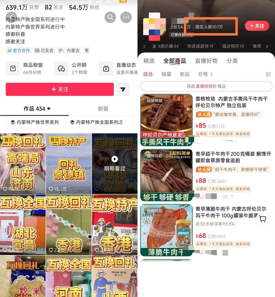 这个账号在抖音也有作品,而且他的变现方式主要就在抖音带货,并且粉丝几十万,流量也不低,因为都比较好奇,流量起来就是带货自己家乡的各种特产,所以也在开直播,跟买人数十万多。