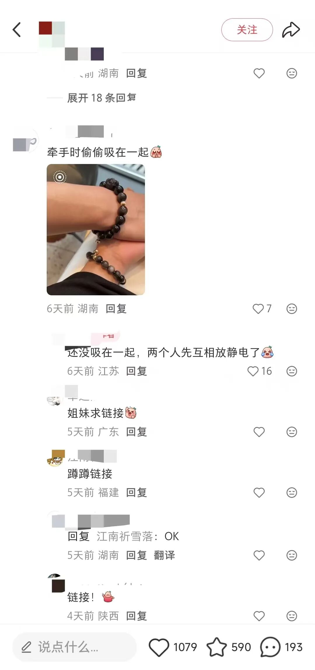 那这样的笔记不用猜,肯定是有很多商家或者素人推荐自己或者自己买过还不错的产品推荐,比如就有这样一个手串评论,发的live动态图,也是比较有创意,两个手签在一起,那个东西就会合在一起,情绪价值给够。