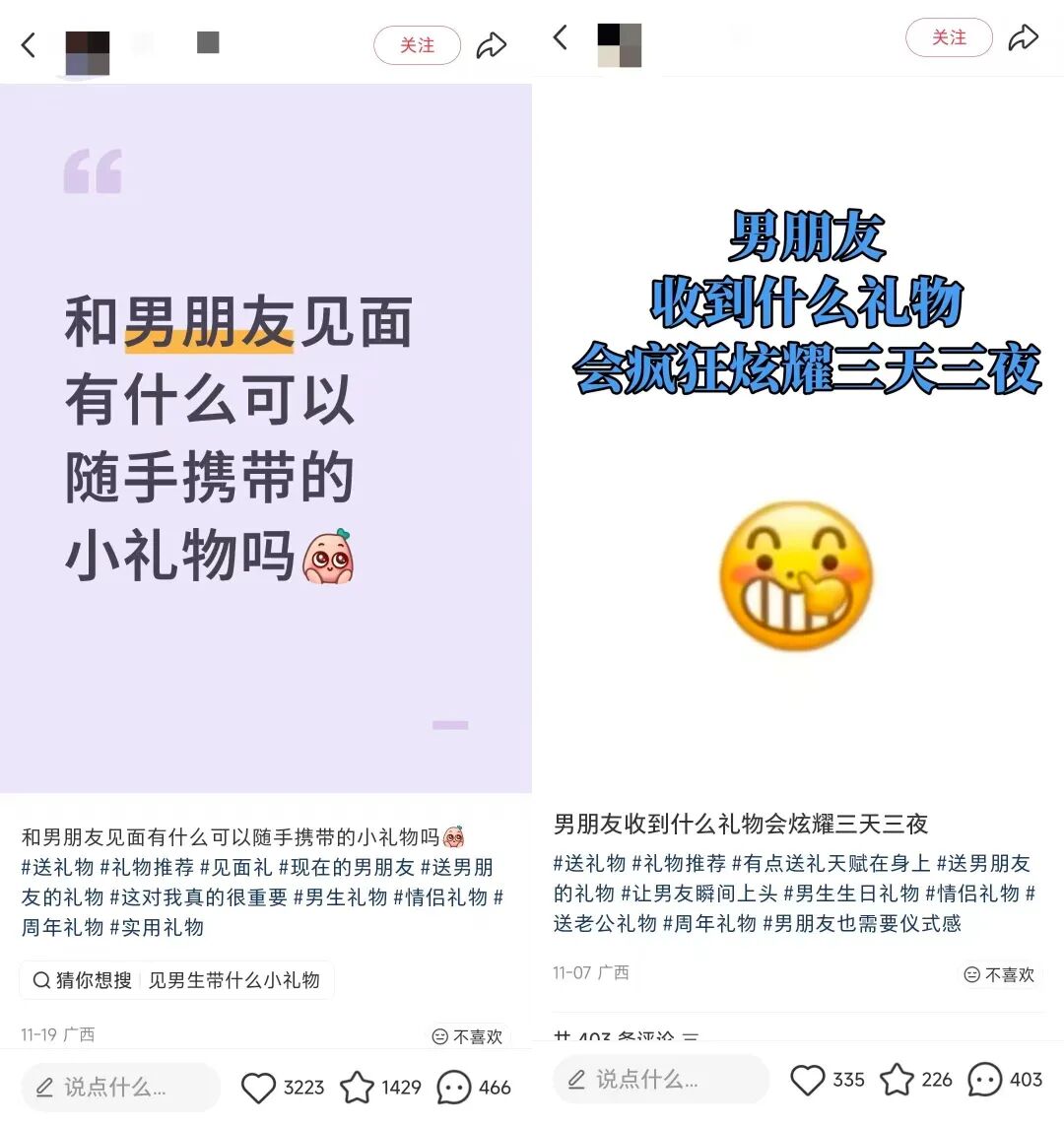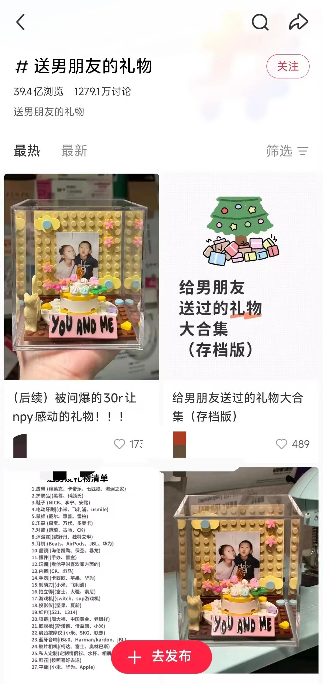 有趣的事情也是可以给我们学习的事情出现了,那如果你是商家,是不是想办法找到更多这样的笔记,所以就可以直接搜索关键词或者直接点击话题,比如下面这个送男朋友的礼物,就可以看到很多笔记。