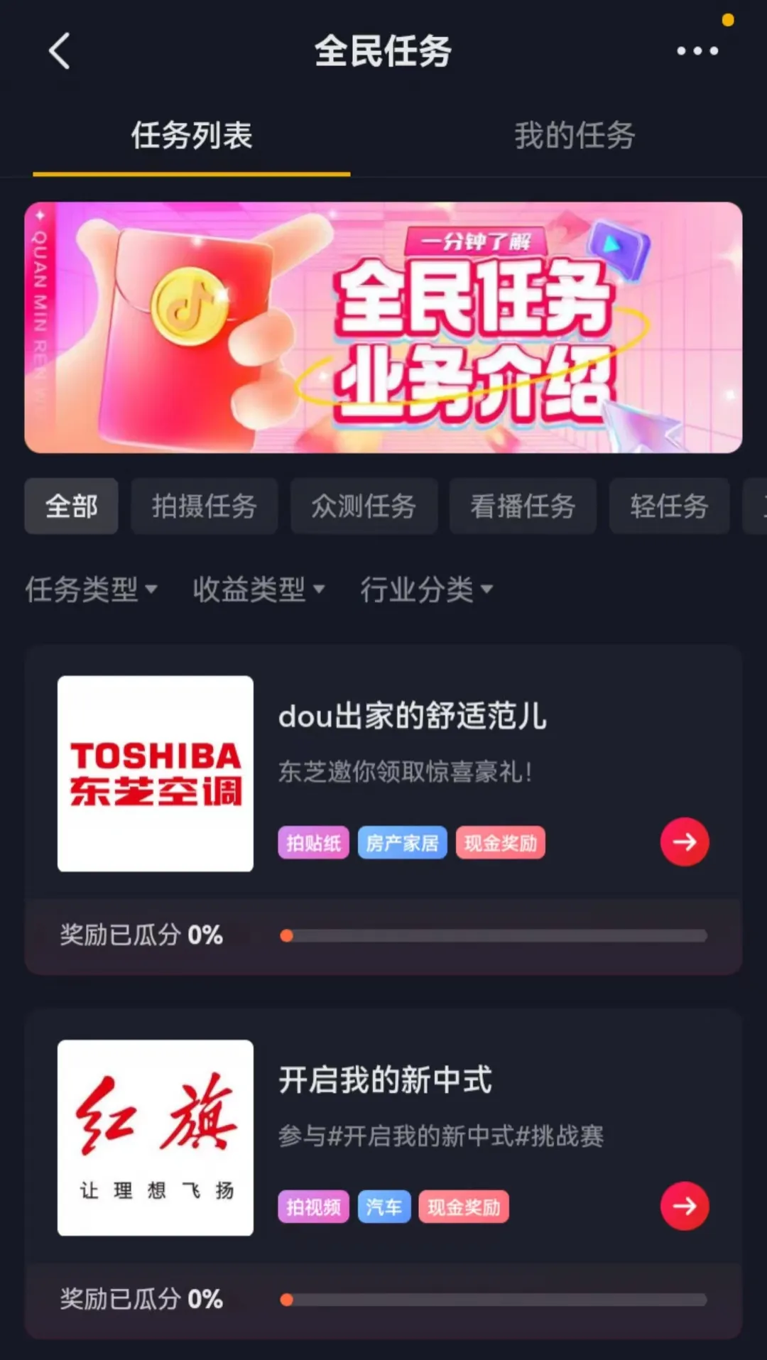 全民任务是官方平台的变现方式。如果我们的账号有一定的起色,可以去看一下全民任务里面有没有合适我们的任务,接了后去拍摄就可以了。也是按照播放量来计费,或者有些任务是给了流量扶持的,零粉丝的账号也可以做。