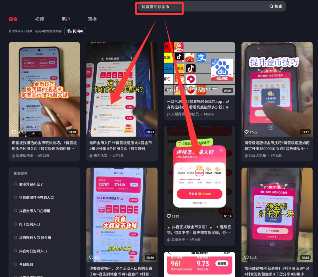 抖音搜索一些签到领金币的视频,然后分享,复制链接,去水印。