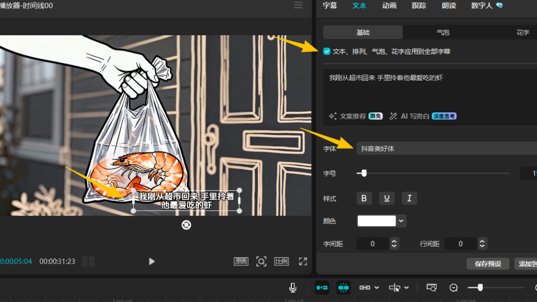 把deepseek生成的文案复制进去,然后选一个自己喜欢的音色配音,打开【智能分割】–添加到主轨道,