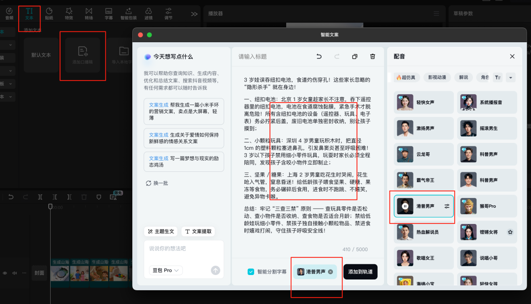 第五步:剪映剪辑 将前面生成的所有视频和图片,都导入到剪映内,然后按照顺序拖入主轨道内,添加转场,稍显刺激紧张的背景音乐。然后可以利用口播稿的方式,生成音频和字幕。操作方式如下图所示: