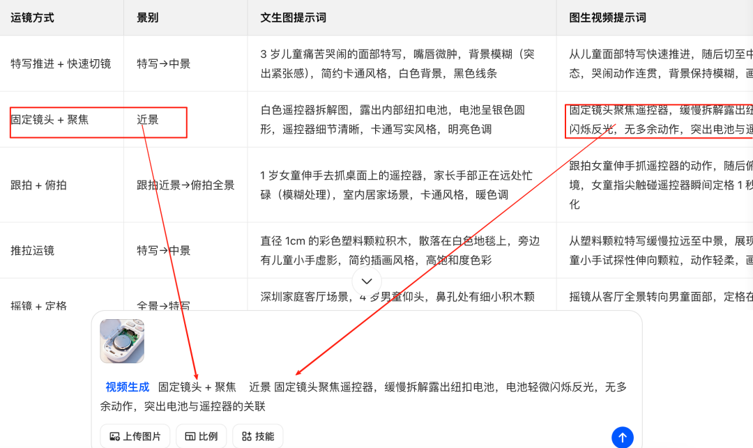 然后复制表格内的运镜、景别、和图生视频提示词,结合图片,让豆包给我们生成视频。如下图所示: