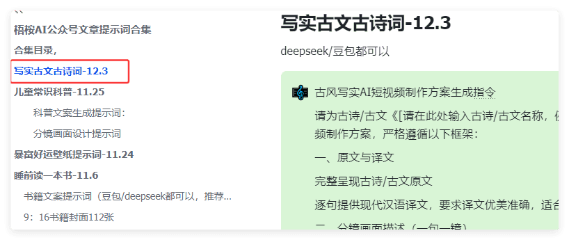1.工具箱这个提示词,deepseek和豆包都是可以的,不止是古诗,古文也没问题的,例如在第一句提示词输入古文名称