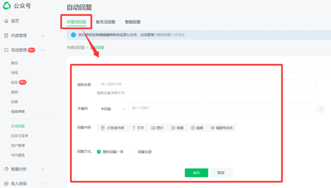 然后进入公众号的后台找到自动回复这个选项,选择关键词回复,回复内容就是咱们工具的网盘分享链接,设置完之后自己测试一下,看看能否正常发送。