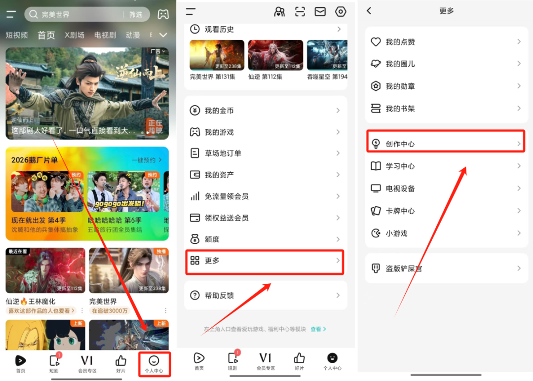 登录好之后,在首页点我的,再点更多,之后可以看到创作中心