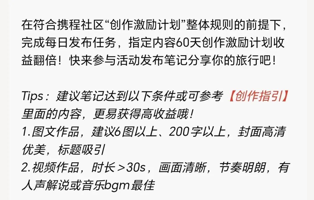 当前抖音小红书旅游赛道竞争惨烈,但携程内容版块尚有红利——平台为鼓励创作,新人按要求发满3篇笔记基本能领取奖励。