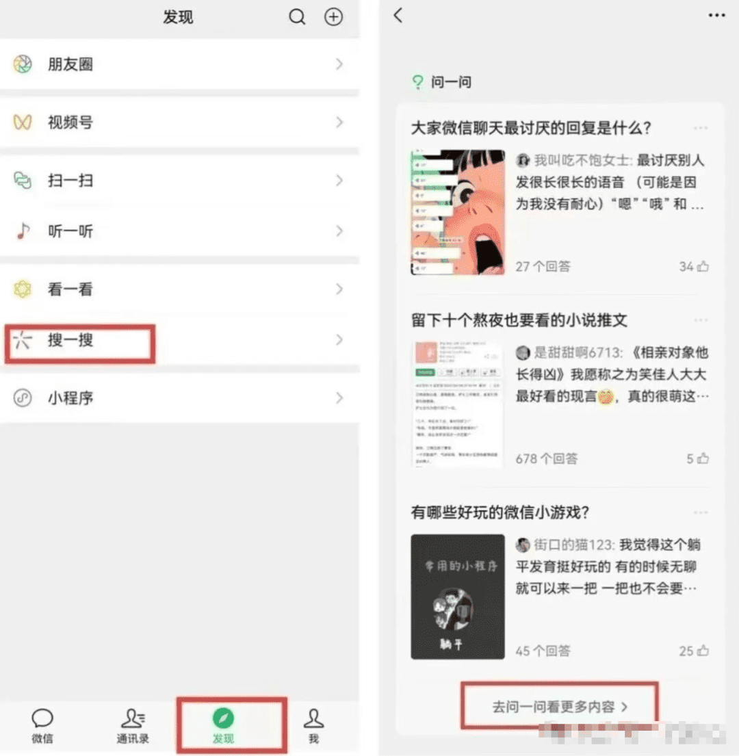 问一问的入口在微信的“搜一搜”里面,流量来源很广。