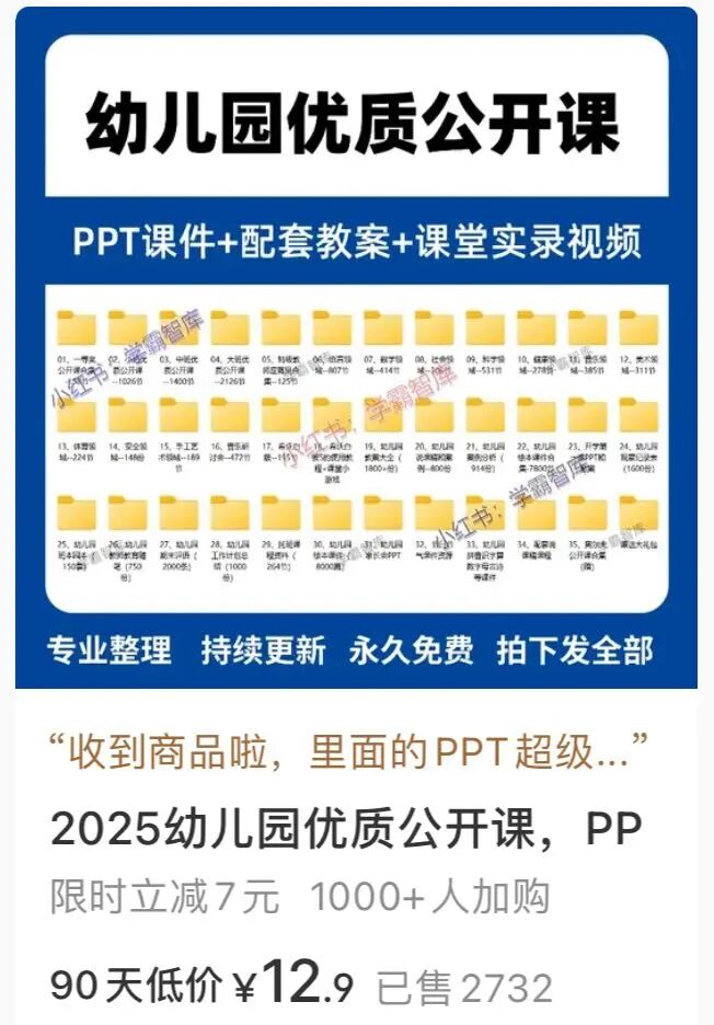 这里得提一嘴,不是所有品类都能随便搬,比如定制课件这类,搬运容易被投诉侵权。但像幼儿园公开课资料包、考试重点合集这种,小红书上一份卖百八十块很常见。