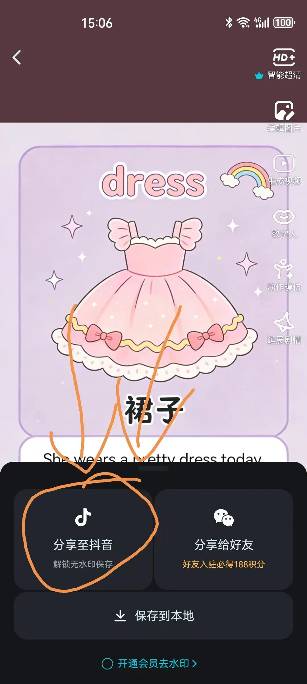 不过图片跟视频水印能去,但是如果你是用AI生成的内容在平台发布的时候,也记得要标明是AI生成的昂1. 即梦图片去水印手机端生成的即梦图片直接无水印保存下来很简单直接点击你生成好的图片,选择下方的保存,在跳出的选项中选择分享到抖音这时候图片就会自动保存到你的手机相册里面,是没有水印的