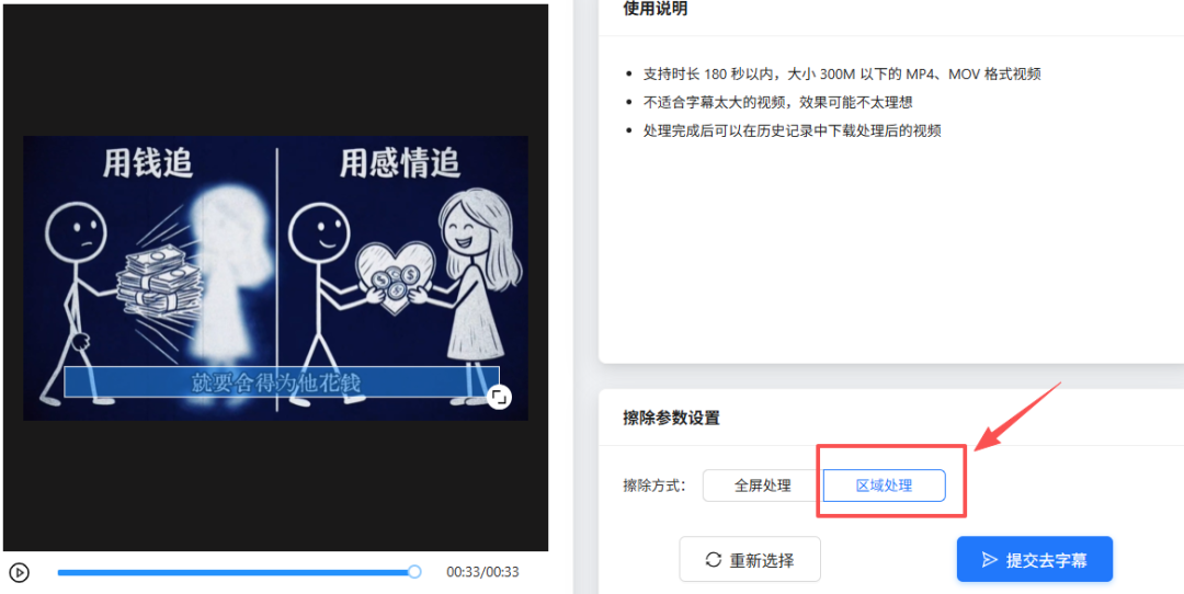 如果是其他AI软件生成的,那就要借助工具了这个软件不仅可以去除固定的水印,字幕,移动的水印也可以去除软件无需登录,打开即用上传你的视频如果要去除固定的内容,选择区域处理,然后框选内容即可