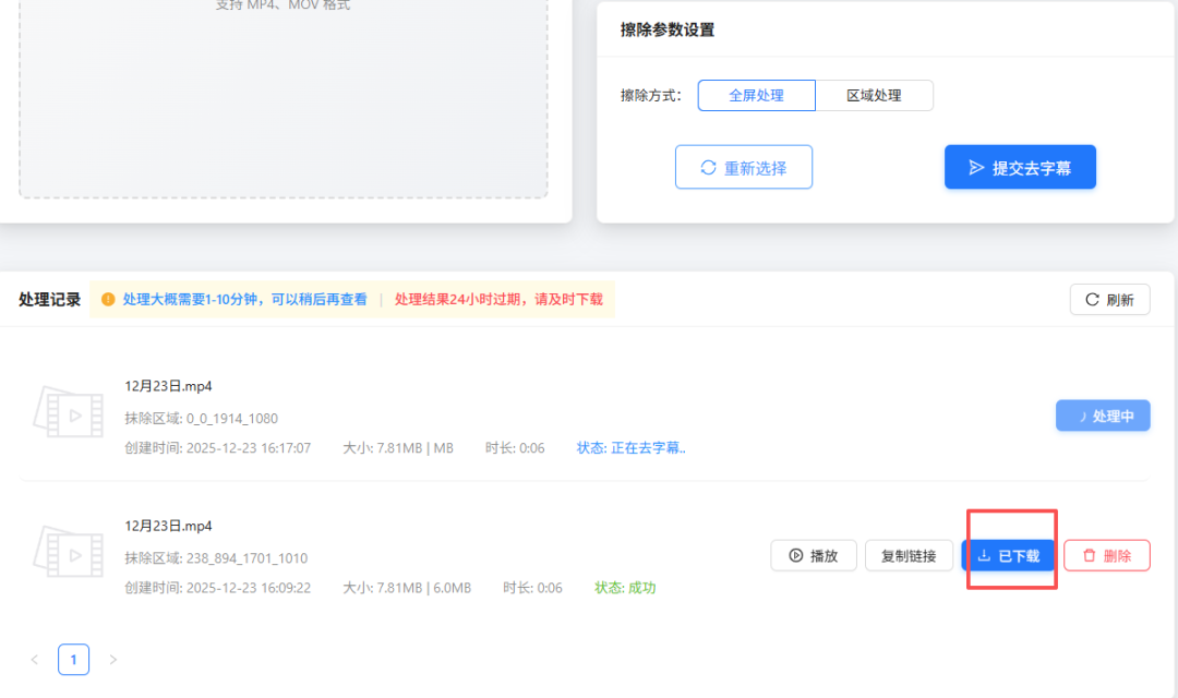 如果要去除移动水印的话,就选择全屏处理但是全屏处理的话,可能会将视频里面的其他文字也都去除掉处理好以后会在下方提示,直接下载即可