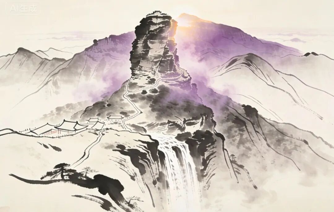 中国庐山山脉的清晨景色,阳光照在高耸的山峰上,山顶云雾缭绕,淡紫色的雾气缓慢升起,画面安静,国风风格,镜头稳定,远景