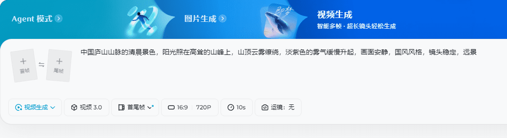三、第二段动画: 《遥看瀑布挂前川》这一句,是瀑布画面第一次正式登场。 Step 1:仍然用「视频生成」选项不要换流程,保持一致。 Step 2:提示词重点变化这一次,重点从“云雾”变成“远望瀑布”。