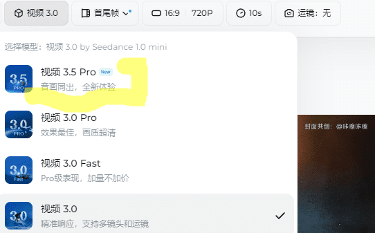 Step 3:参数怎么选(新手操作),如果你在即梦生成时提示词中可加入这些选项,模型可以选最新的视频3.5Pro,也可以就用3.0,其他搭配可以这样选: