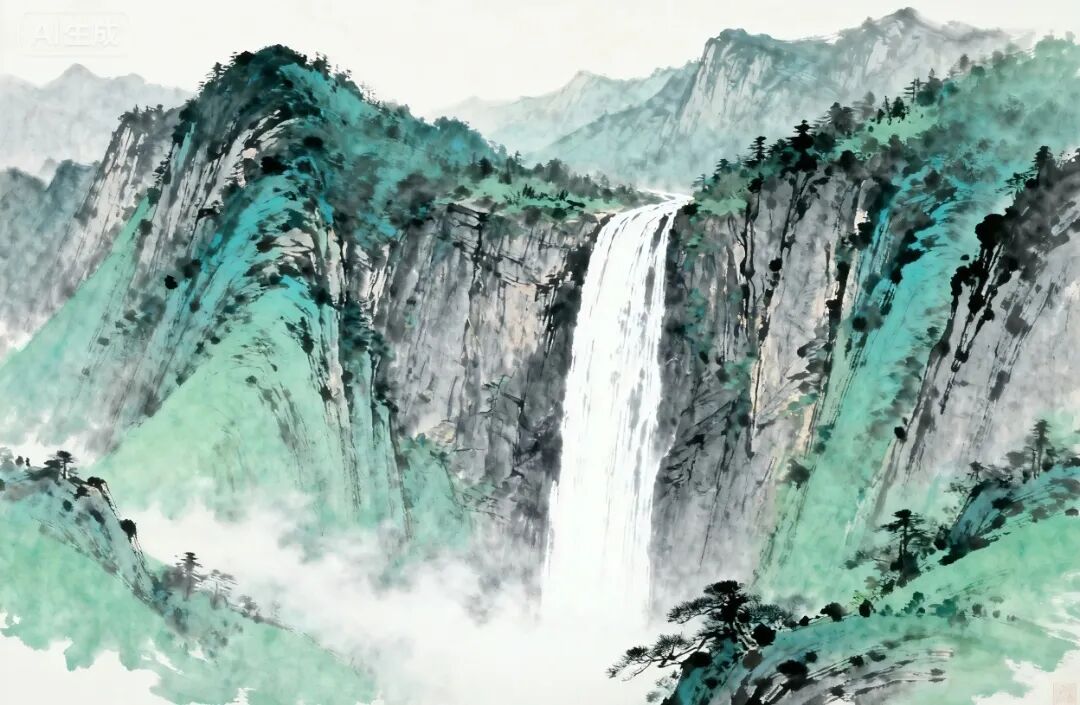 巨大的瀑布从高耸悬崖直冲而下,水流速度快但连续,形成强烈垂直落差,下方水雾翻腾但不过度,画面震撼但不夸张,国风写实风格