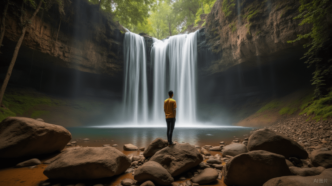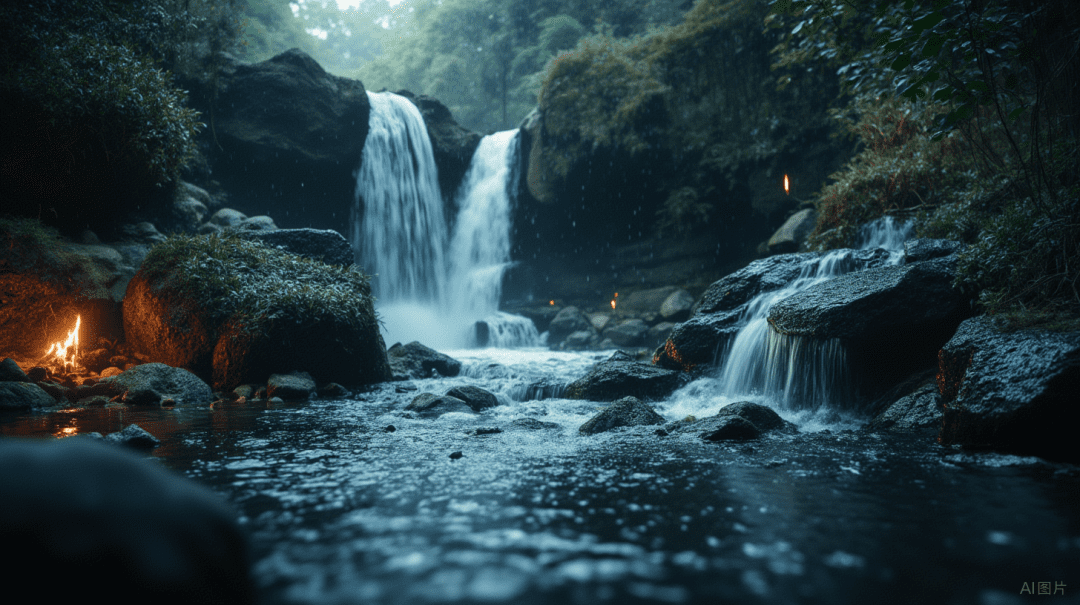 从高空俯视,瀑布仿佛从天空倾泻而下,水流明亮,带有微弱光感,整体仍然是自然山水,没有科幻元素,画面壮阔而克制