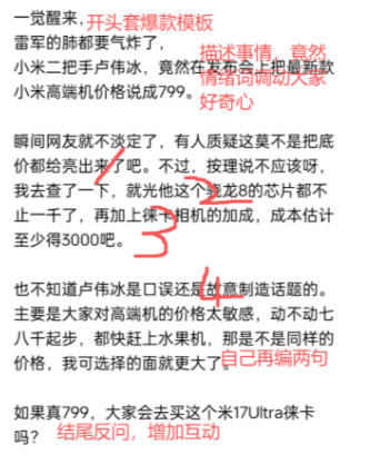 开头把卢伟冰这个事情描述一下,要不然读者都不知道发生了啥。但是有可能很多人都不认卢伟冰。 不过呢,雷军肯定大家都认识对吧,所以我就用雷军开头,蹭一下知名人物的热度。 开头直接套爆款模板。 一觉醒来,雷军的肺都要气炸了,卢伟冰竟然xx 中间就是把网友的评论给整合到一起,变成自己的话。