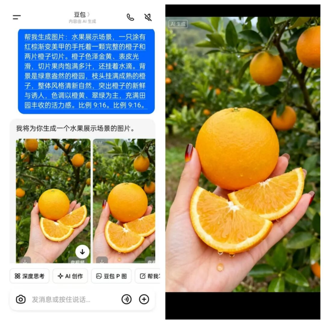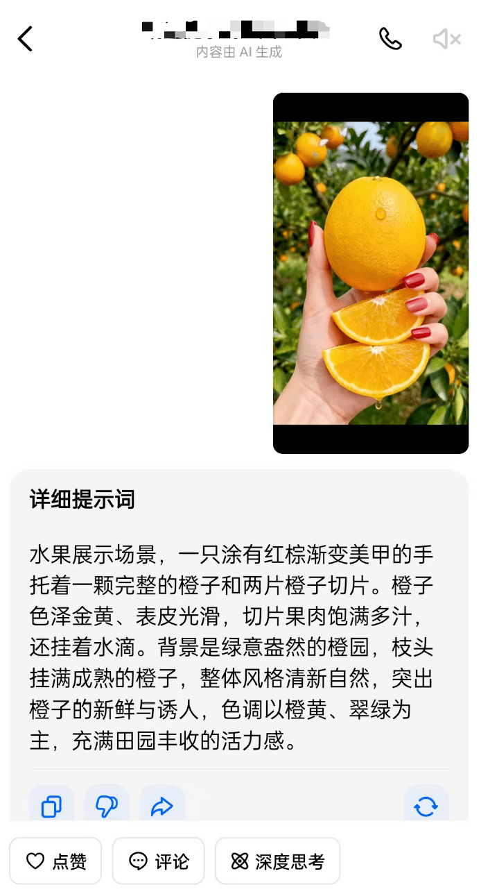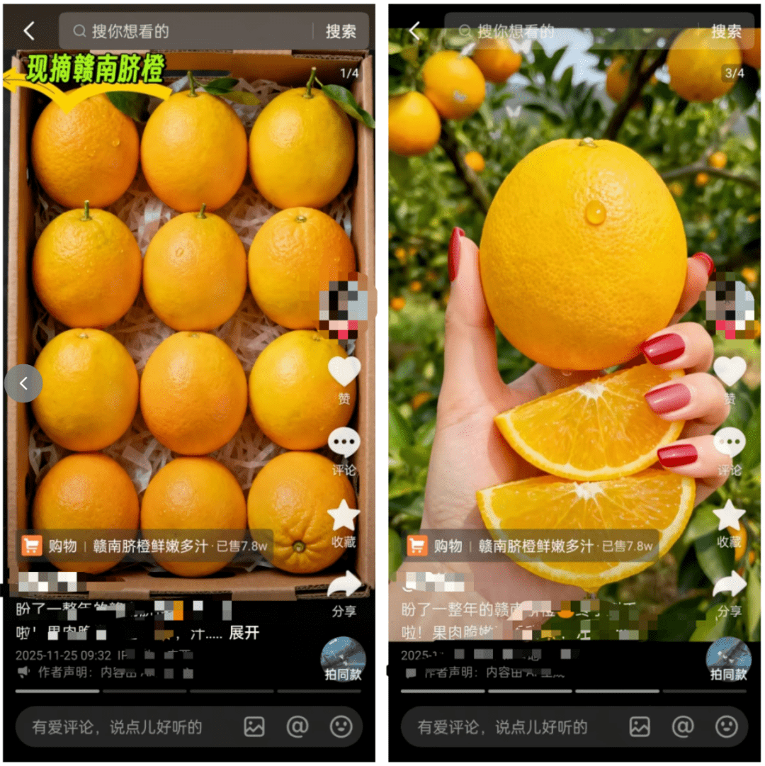 可以看到这个赛道的作品形式和我们之前分享的其他赛道的作品差不多,都是用AI生成的图片,一个作品放3-4张图这样,如果大家想要做的更精细些,也可以把其中的一两张照片换成动图不过今天我主要讲这么做图片,怎么图片转动图在这里我就不多说了,大家还不知道的可以看下我前面的文章,其中有不少都是讲过做动图的依旧是用即梦AI,我们直接搜索脐橙素材,就可以看到很多别人做好的成品图了,我们挑个满意的图,点开他,然后做同款就可以了