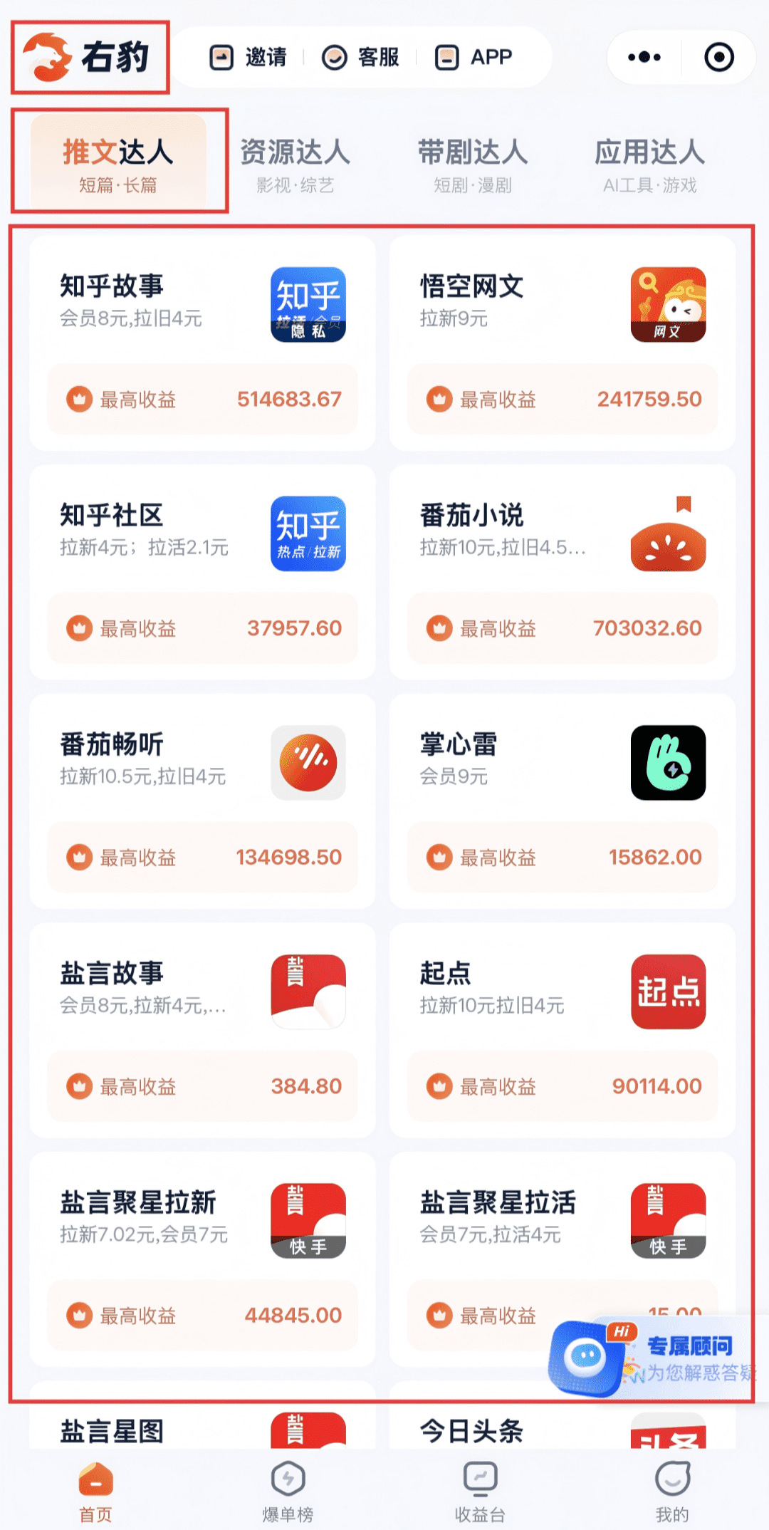 小说推文的视频内容有很多种,比如沙雕动画,解压视频,AI漫画解说之类的有的人会问了,那我不会做视频怎么办?很简单,不需要你做视频,只需要一键剪辑发布即可,软件自动操作,简单无脑03. 小说推文如何操作1. 获取推广权限首先你要选择一个推文的平台,这类平台有很多,如下图