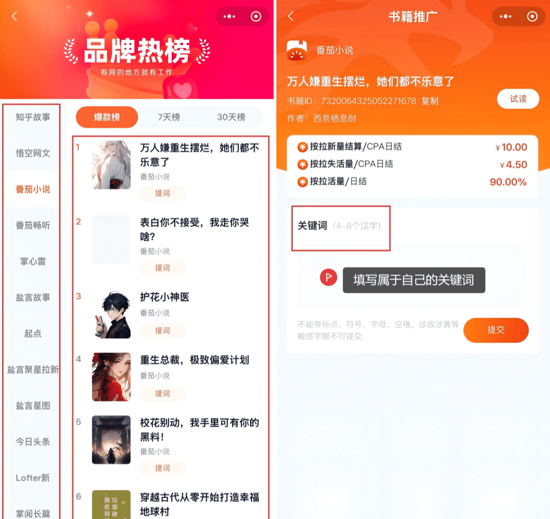 一般我们发布的内容,每到关键部分就没了,用户想看后续内容,自然就去取用关键词去平台搜索相关小说阅读,然后你就能获得收益了~