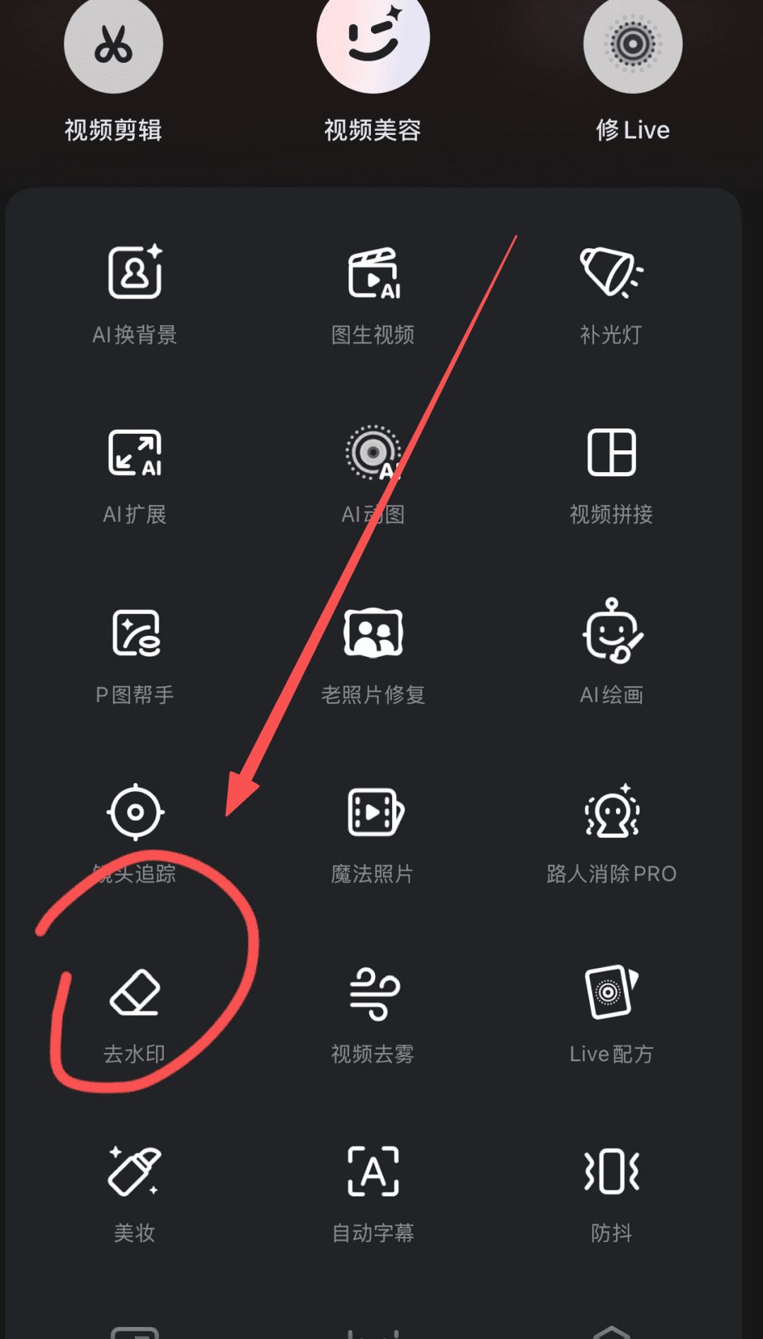 右下角有即梦的水印,我们要去掉它,手机打开wink,按照下图的设置,选择去水印选项,按照提示把左上角和右下角的水印去除。