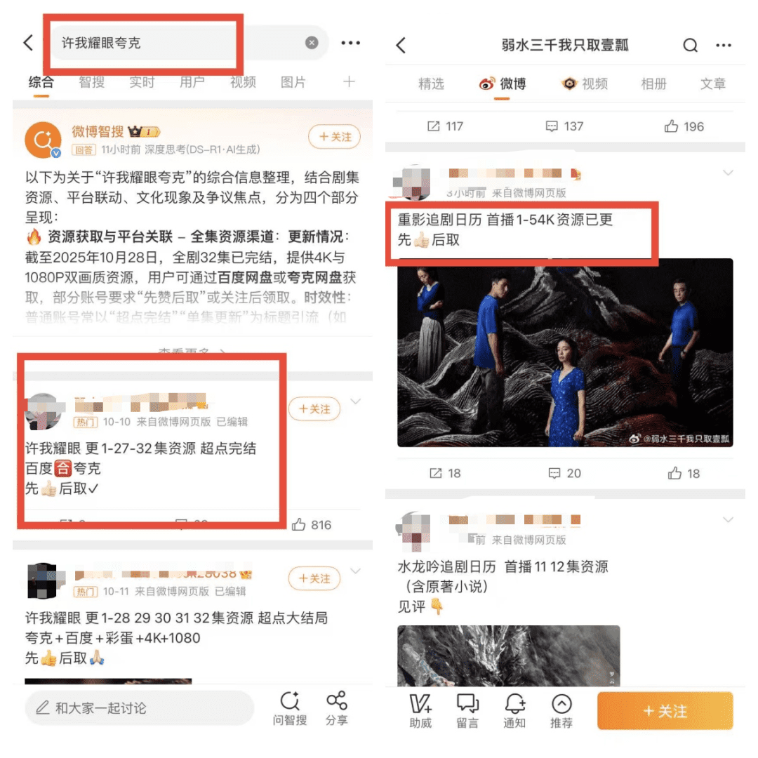 微博直接搜剧名,找同行发的内容,剧名+网盘名字,用这个方法去搜,就能找到很多同行发的内容了,见下图: