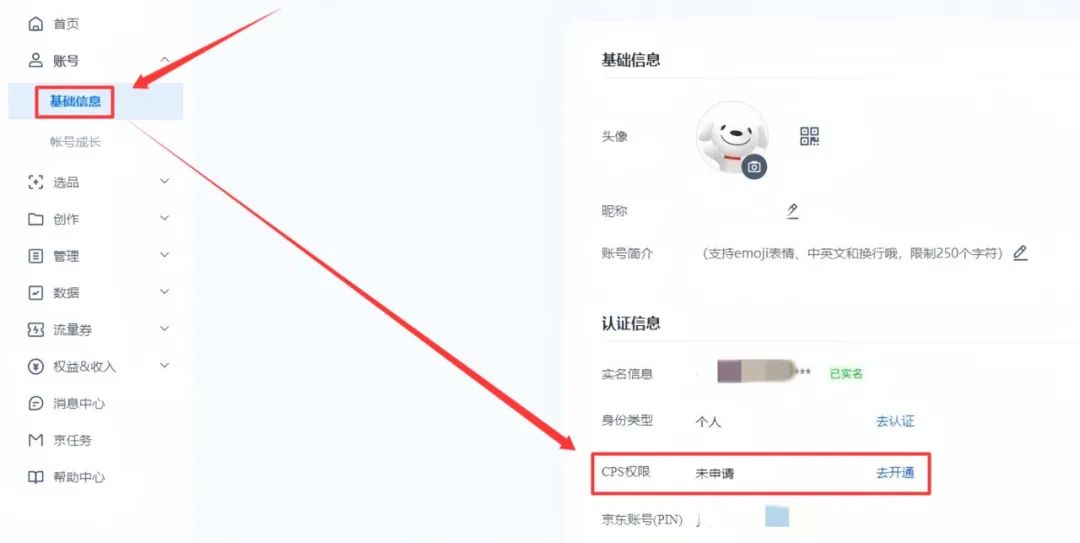 去【京东创作服务平台】用京东账号登录,没有账号就注册一个,填好身份信息,开通CPS权限(就是带货权限)。