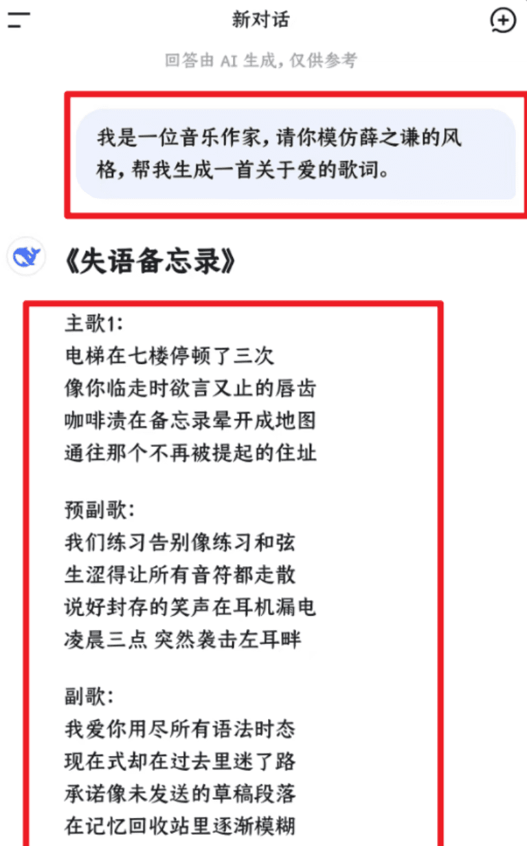 我们让deepseek帮我们生成一份歌词,如果你对歌词不满意,可以多让ai帮你修改和润色,直到满意为止。