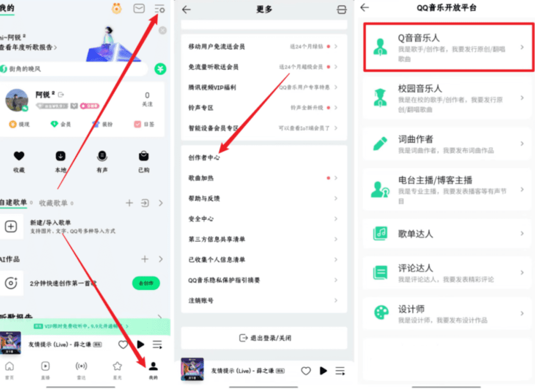 第二步:我们登录QQ音乐之后,找到我的,右上角三横,再找到创作者中心,这里就是音乐人的申请入口。