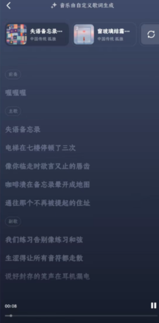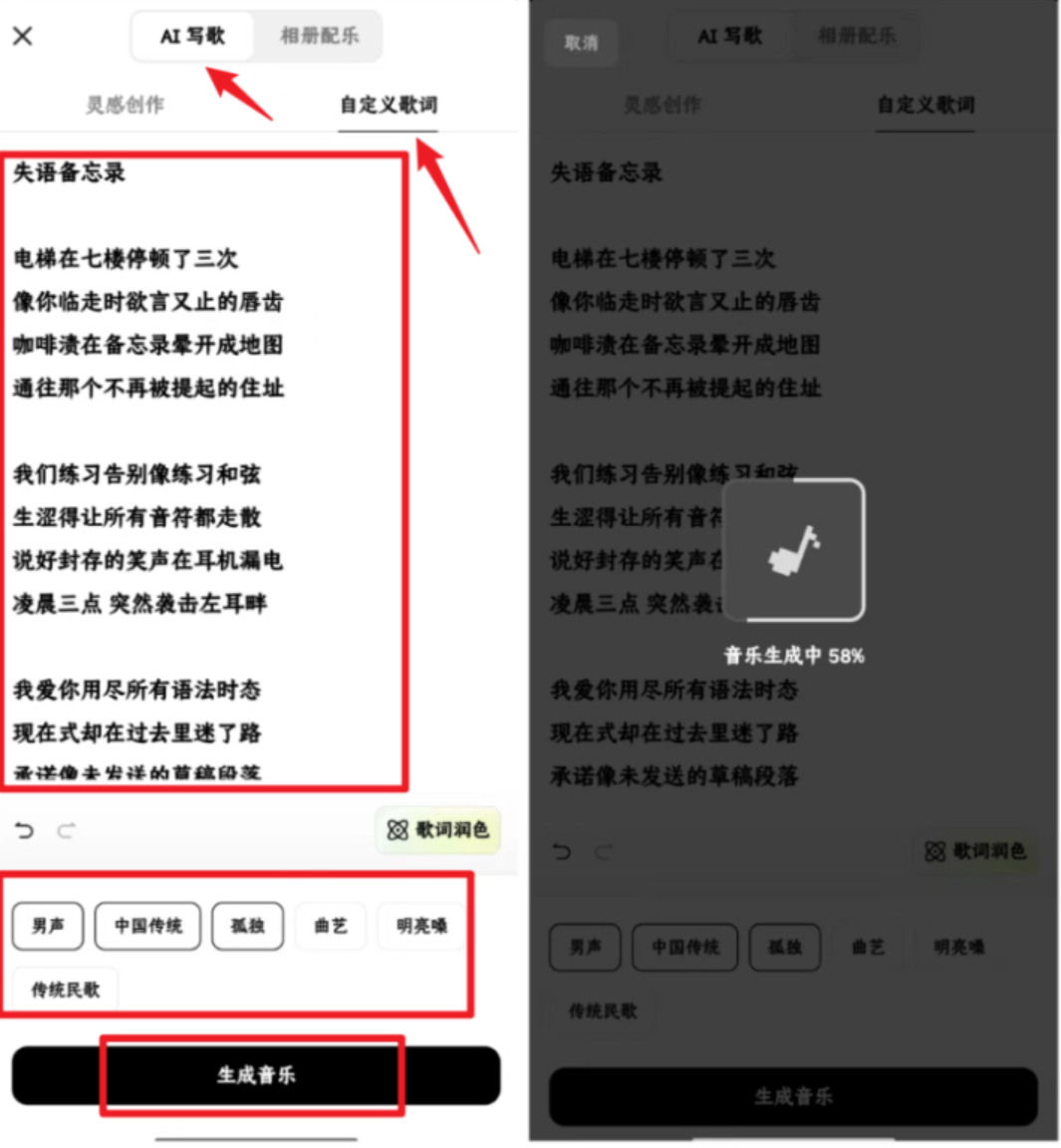 然后我们把之前deepseek生成好的歌词复制进去,等待这个软件自动生成就行了。