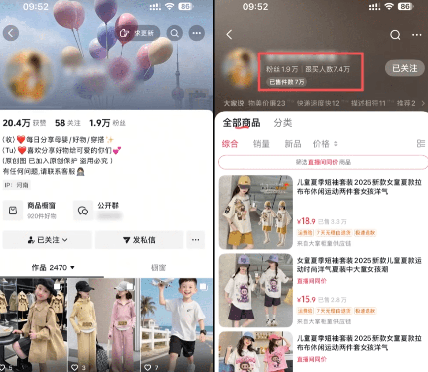 现在童装圈子被AI盯上了。下面这个账号14000多的粉丝作品点赞全是个位数,但却有9.4万人下单,这转化率高到离谱。