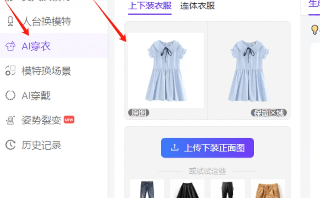 接下来第三步,我们要把带货的服装穿在生成的模特身上,这步是关键。使用AI穿衣软件先上传你要带货的童装图,一定要选白底图,这样生成到模特身上效果更自然。