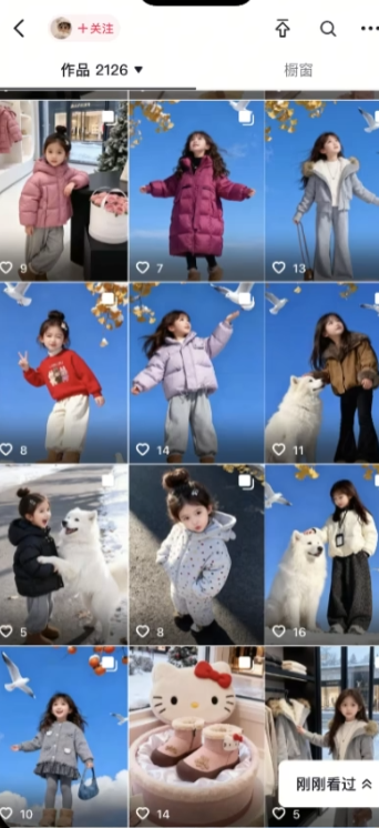 老刘分析第一是这些号都在疯狂堆量,少则几千条作品,多则上万条精准轰炸宝妈群体,以量取胜,自然不愁出单。第二,宝妈们买童装只看款式和上身效果,看到喜欢的直接付款,根本不纠结点赞多少。